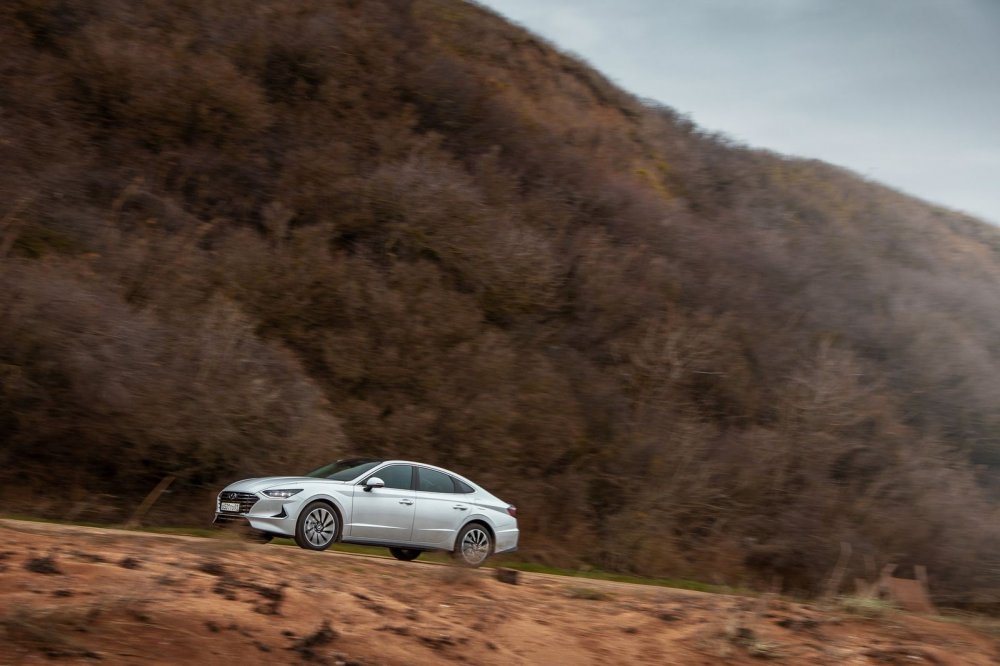 При наборе скорости мотор наполняет салон шумом, но его теперь меньше, чем было на машине предыдущего поколения. Сказать, что шум есть, а разгона нет, тоже было бы неверно. Однако, погоняв машину с 2,5-литровым двигателем, живо представляешь, как машина будет ускоряться с базовым двигателем и автоматом. Видимо, вяловато… Новую Sonata, конечно, нельзя сравнить с тихоходной баржей, но после того, как стрелка тахометра переваливает за 120 км/ч, манёвры на машине в принципе противопоказаны. Она крайне неуверенно чувствует себя при сбросе газа перед входом в поворот, а если не закончить с торможением к моменту входа на дугу, Соната и вовсе может «растеряться».