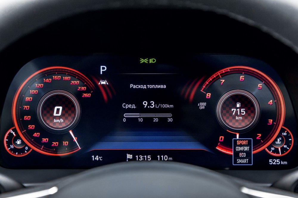 Вообще, к логике переключения, особенно на при сбросе газа и торможении, иногда возникают вопросы… Что касается режима Sport, в нём вообще всё зачастую получается плавнее и мягче, чем в «Комфорте», и даже стрелка тахометра не всегда доползает до красной зоны в 6500 об/мин, что, в общем-то, не так важно. Ведь, как и на других «Хёнде», при смене режимов управления силовым агрегатом щиток приборов здесь становится красным со шрифтами как в Subaru WRX STI, в «Эко» – зеленоватым, при этом читаемость его шкал радикально не меняется, оставаясь на относительно невысоком уровне. Притом, что уровень графики, повторимся, очень высок.