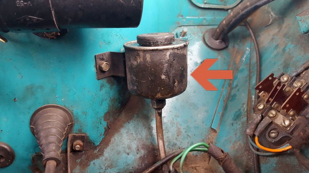 А вот эта крошечная жестяная баночка – бачок главного тормозного цилиндра. Тормозная система была одноконтурной, и при потере герметичности в какой-то точке системы тормоза исчезали полностью на всех колесах. Увы, для тех лет это было нормой – в том числе и в зарубежном автопроме.