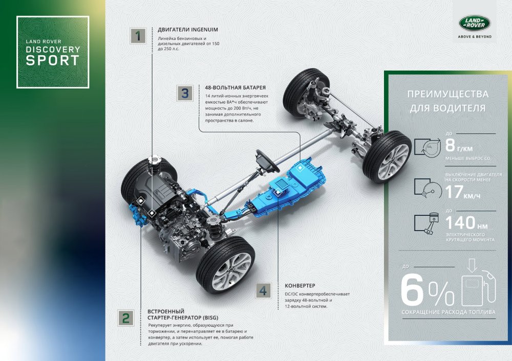 По части силовых агрегатов всё тоже пришло в соответствие с тем, что мы уже видели опять-таки в Evoque: это планомерная «мягкая гибридизация» линейки, которая так же планомерно до нас не дошла. В Европе единственная версия Discovery Sport без стартера-генератора и 48-вольтовой батареи – это базовая, в которой нет заодно и полного привода, и девятиступенчатого «автомата» ZF. Все остальные машины этим набором оснащены: стартер-генератор, связанный ременной передачей с коленвалом, подкидывает мощности на разгонах, а на торможении, наоборот, генерирует электричество и запасает его в батарее. Батарея в такой схеме не может питать машину автономно, но и никогда не разряжается полностью. Эта та же схема torque fill, что и у прочих «мягких» гибридов: она лишь немного облегчает жизнь мотора и водителя, слегка компенсируя турболаг, а также обеспечивая на 7% меньший расход топлива и на 10 г/км меньшие выбросы CO2.