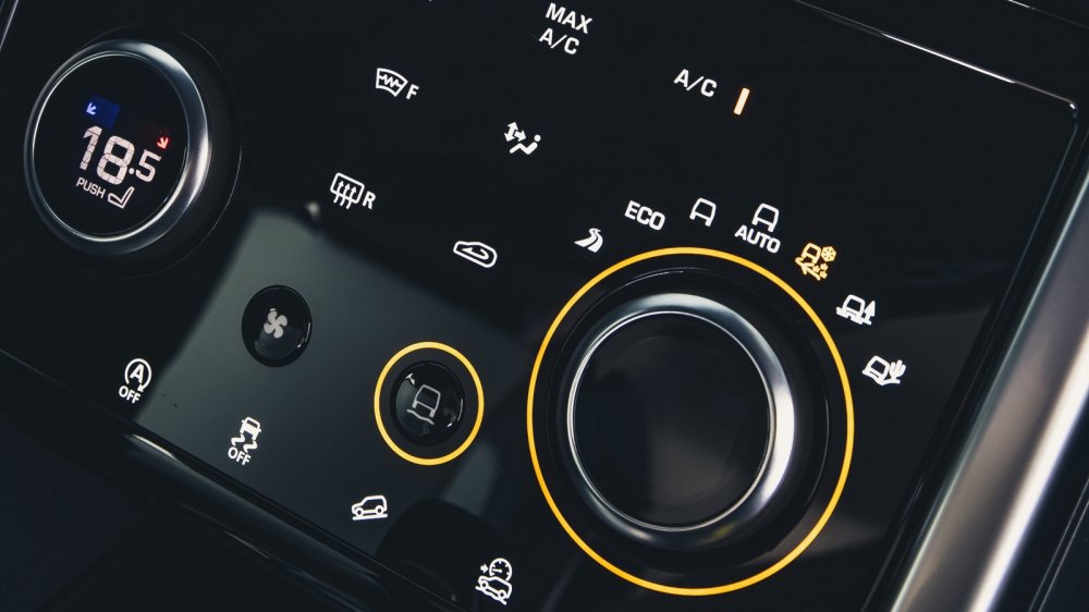 А вот с нижней сенсорной панелью всё не так однозначно. С одной стороны, фирменная схема с удобными поворотно-нажимными регуляторами, которые могут управлять температурой, интенсивностью обдува, обогревом и вентиляцией сидений, а заодно и внедорожными режимами, удобна. В сами регуляторы вписаны монохромные экраны, отображающие настройки климата, а прочее выводится вокруг них в зависимости от выбранного режима управления. Но вот все прочие клавиши вроде обогревов стёкол, интенсивного охлаждения салона, управления системой стоп-старт и так далее – сенсорные, и попасть в нужную зону на ходу довольно сложно, а неосторожный «свайп» рукой способен вызвать настоящую вакханалию. Опуская очевидные эксплуатационные недостатки вроде быстрой загрязняемости большого чёрного глянцевого полотна, порадуемся хотя бы тому, что клавиши контрастные и хорошо читаются даже днём, а оранжевая индикация включения информативна.
