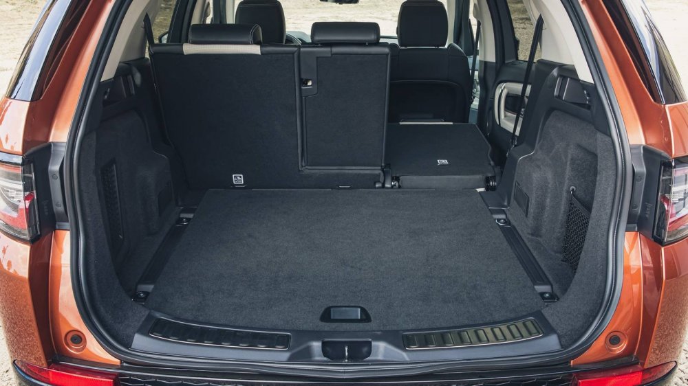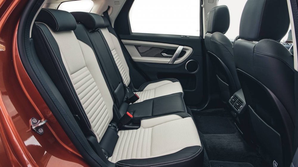 Задний ряд изменился мало: колёсная база здесь на 6 сантиметров больше, чем у Evoque, – 2 741 мм, так что пассажиры второго ряда чувствуют себя вольготно, а плоский диван вполне лоялен и к третьему седоку. Третий ряд при длине машины в 4 597 мм здесь ожидаемо скромный, но усадить на него детей вполне можно – а большего от него ждать и не стоило бы. Кстати, детям на втором ряду пригодятся зарядные порты, и в «Диско Спорт» их можно заказать до 6 штук.
