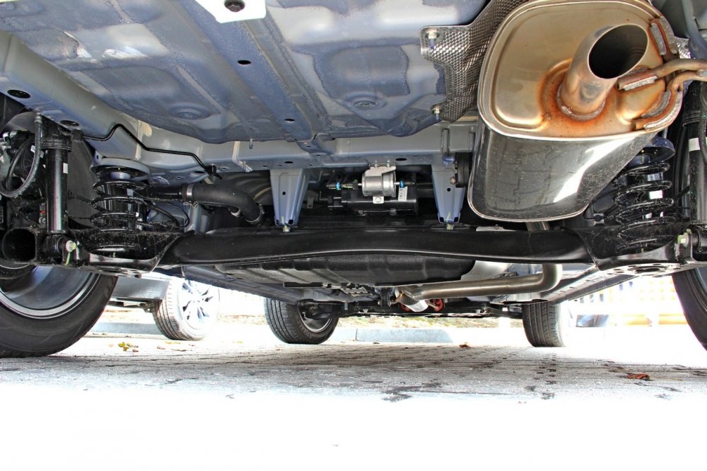 При езде по сухой грунтовке короткоходная подвеска то и дело пропускает удары, но удары эти, к счастью, глухие, самортизированные буферами отбоя, так что нет ощущения, что автомобиль вот-вот развалится, то есть вполне себе дачный вариант. На гравийных участках слышно, как камешки барабанят по днищу, у которого нет никакой антигравийной защиты – ещё один источник питания дилеров.