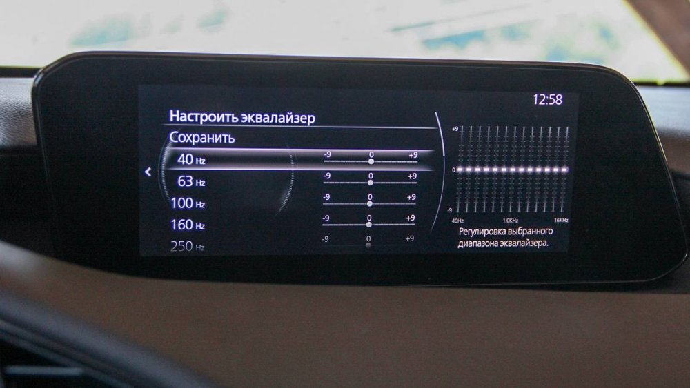 В итоге звук распространяется более естественно, словно вы сидите в домашнем кинотеатре, при этом на максимальном уровне громкости ничего не бубнит и дребезжит. Обработка музыкального тракта – безупречна. На выбор слушателя есть несколько штатных настроек эквалайзера под тот или иной стиль музыки, а для подлинных меломанов – ручная регулировка аж по 13 каналам! Скажу честно, я настолько увлёкся изучением музыкальных возможностей новой Мазды, что пропустил обед, и ничуть об этом не жалею – очень классный и сбалансированный звук! Даже во флагманском кроссовере Mazda CX-9 звучание не такое чистое.