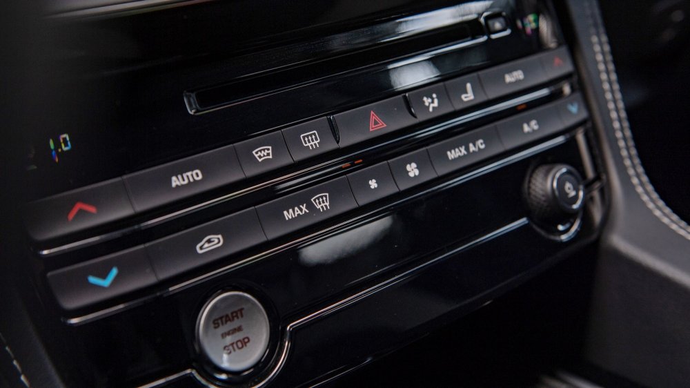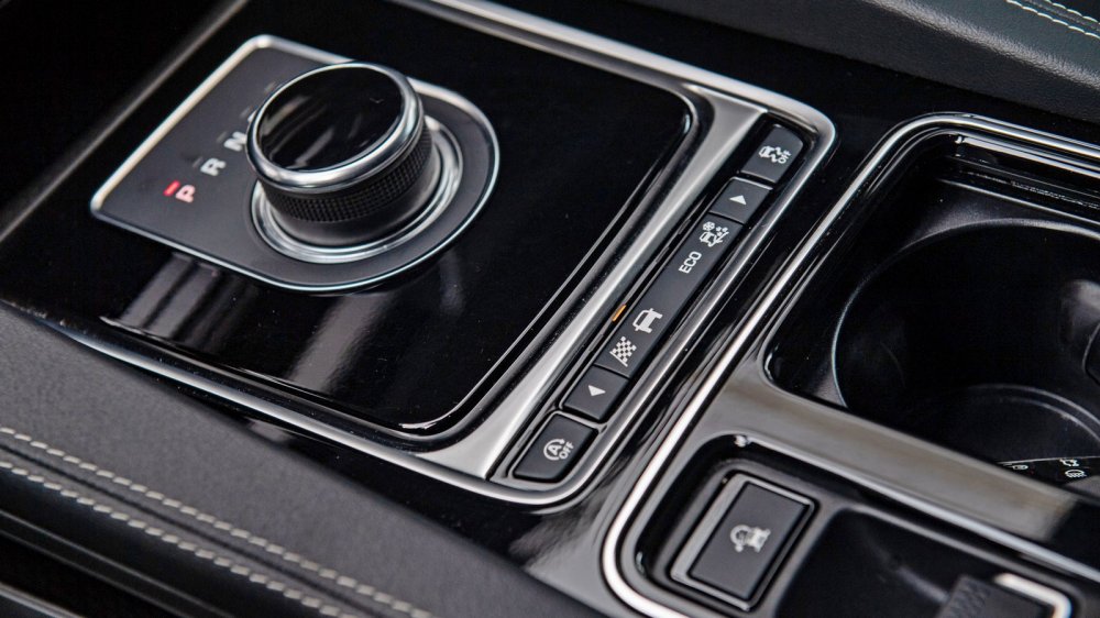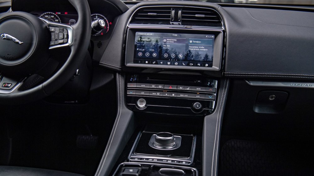 Впрочем, о цифрах поговорить мы еще успеем – пока бегло ознакомимся с интерьером. Архитектура с тремя экранами нам уже знакома, ее постепенно получают и другие модели – не только Velar, но и, к примеру, новый Evoque. Правда, здесь основной экран мультимедийной системы жестко вписан в переднюю панель и не регулируется по углу наклона. Но это не проблема – он удачно скомпонован и почти не бликует, в отличие от нижнего экрана управления микроклиматом, который укрыт глянцевым пластиком и на солнце почти полностью слепнет. По счастью, основное управление все же вынесено не на него, а на крупные шайбы по бокам: на монохромных дисплеях в центре них отображается температура, и шайбами же остроумно реализовано управление обогревом и вентиляцией сидений – вытягивая или нажимая на безель, можно выбрать нужную функцию.