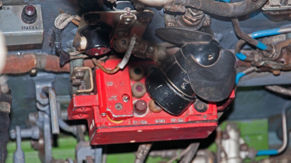 Левая педаль — это педаль РСА (регулируемого соплового аппарата). Он изменяет частоту вращения свободной турбины за счёт изменения угла поворотных лопаток в проточной части двигателя перед её рабочим колесом. Свободная турбина через редуктор соединена с трансмиссией. Эту педаль используем и как сцепление, чтобы включить передачу, и с её же помощью тормозим двигателем. Прежде чем включить передачу (две коробки, по одной на каждой борт, управляются одним “рычагом избирателя скорости”, перемещаемым по гребёнке), педаль надо выжить. Лопатки РСА встают в такой угол, при котором турбина переходит в режим нулевой мощности. Кстати, вот это отсутствие жёсткой механической связи мотора с коробкой передач и не даёт танку заглохнуть, даже если упереть его в стену.