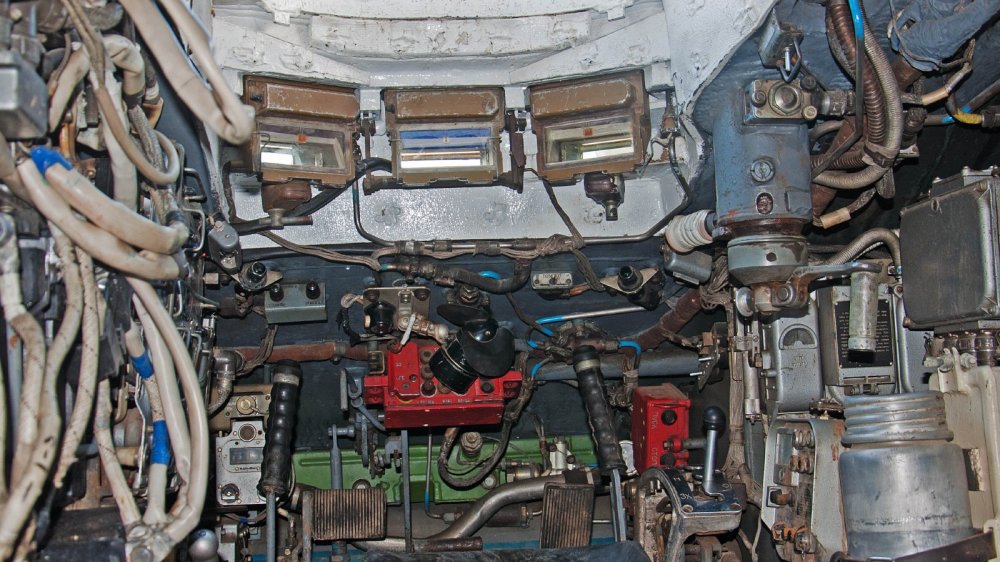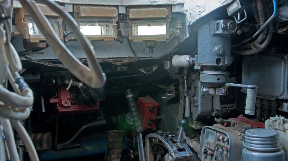 Итак, вот оно — место водителя. Обзор здесь получше, чем в Т-62, да и сидишь прямо по центру, а не слева, но… Но всё равно почти ничего не видно. Из удобств — вентилятор перед лицом. Что ж, хоть за это спасибо.