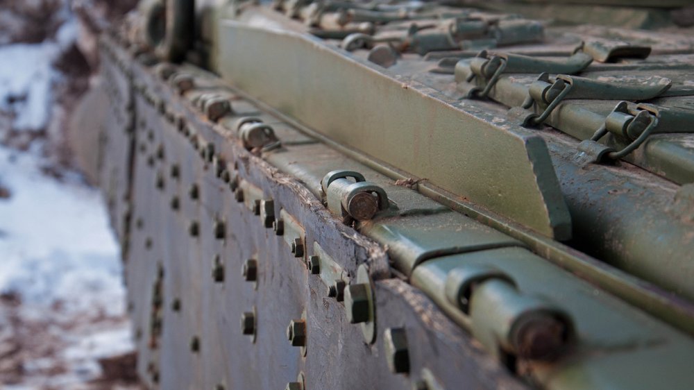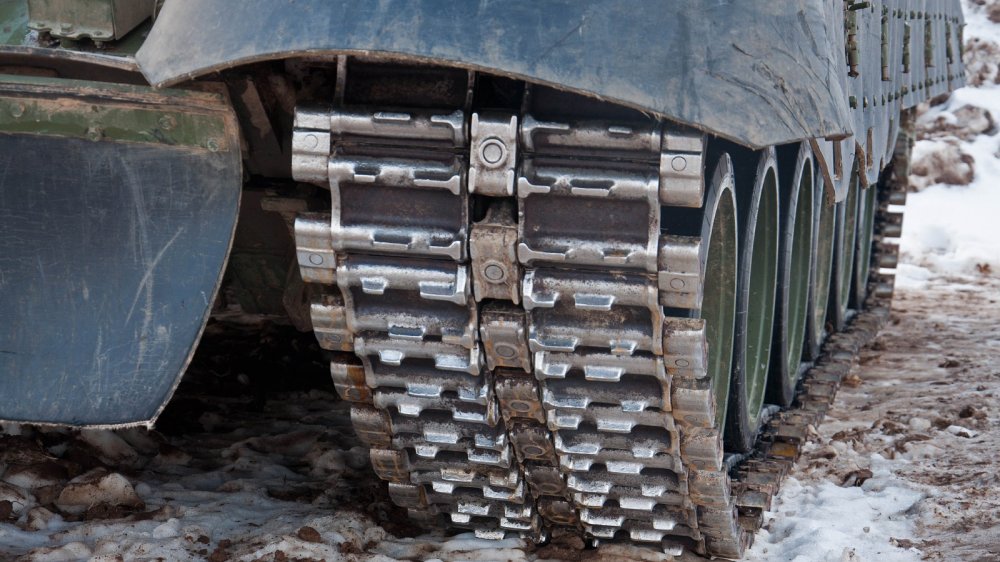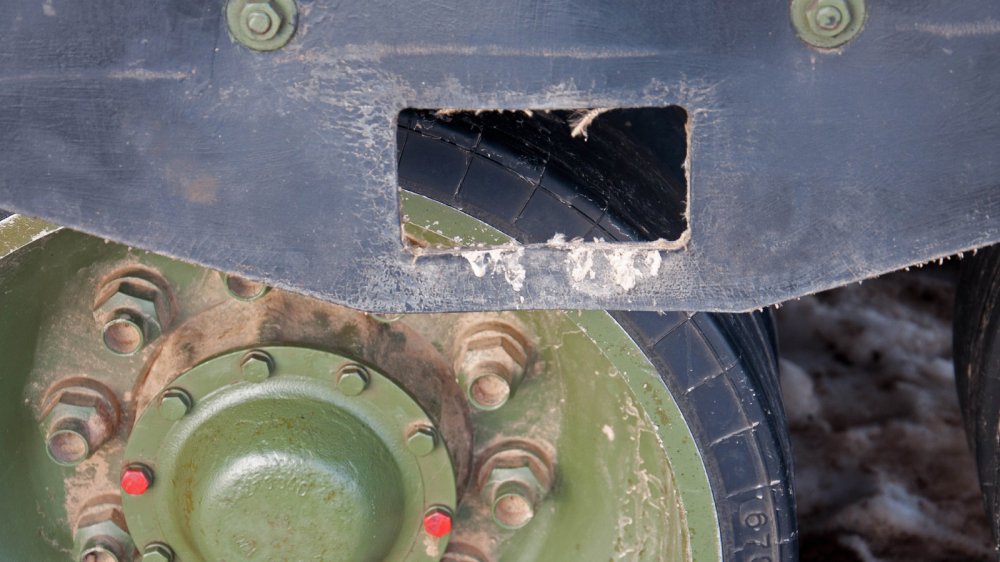И первое, что мы видим — непонятные резиновые накладки на гусеницах. Для чего танку такой наряд Наташи Ростовой на первом балу? Явно не для красоты. На самом деле этот резиновый обвес не совсем резиновый и не совсем обвес. Это - противокумулятивные щитки. А сделаны они из армированной резины с броневыми плитами. Работает эта штука просто: кумулятивный снаряд, летящий в танк, подрывается об этот щит, после чего до брони борта и трансмиссии основной заряд уже не достаёт. А ещё в этих щитках есть прорези, по которым, как по подножке, можно легко забраться на броню. В конце концов, это просто красиво.