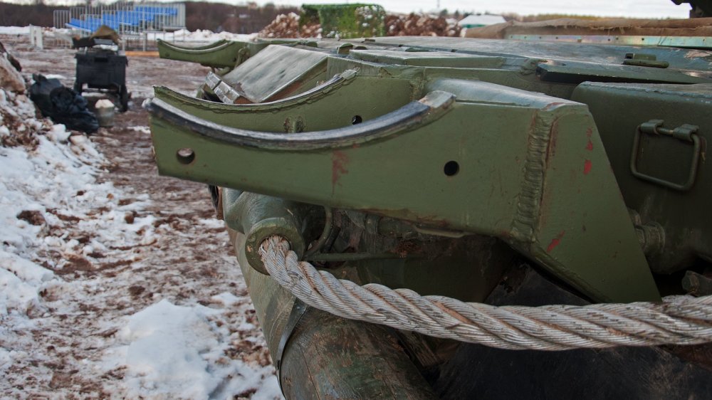 Теперь посмотрим на танк сзади. К корме танка прикреплено обычное бревно, окрашенное в жизнерадостный армейский зелёный цвет. Зачем танку это полено? Любой образованный человек знает, что это не полено, а специальное “оборудование для самовытаскивания”. В это же оборудование входят трос (и не просто трос, а какой-то царь-трос) и набор креплений. Если танк увязнет, бревно крепится к гусеницам, после чего он теоретически может выбраться из грязи.