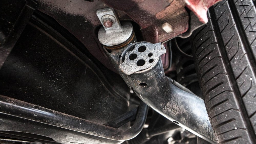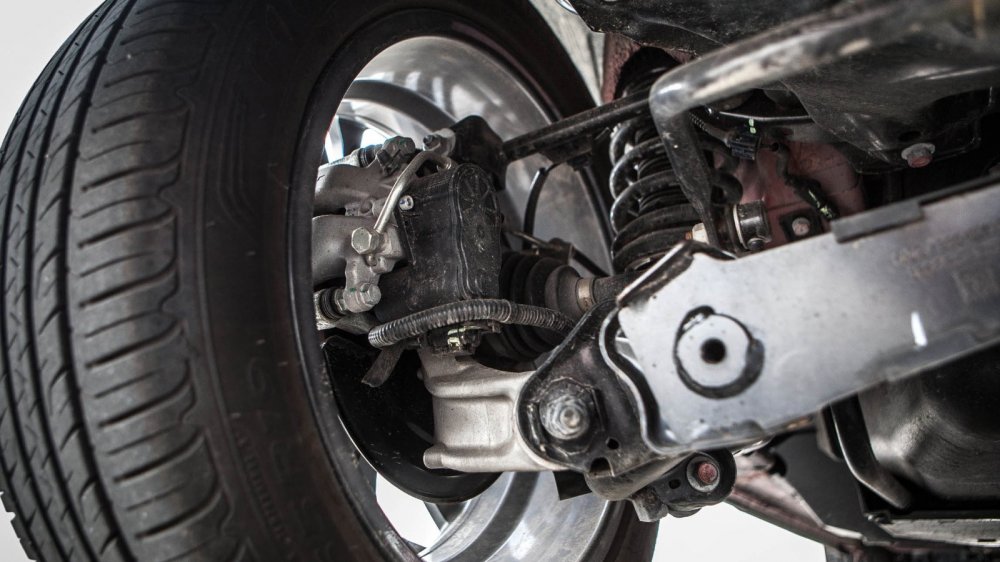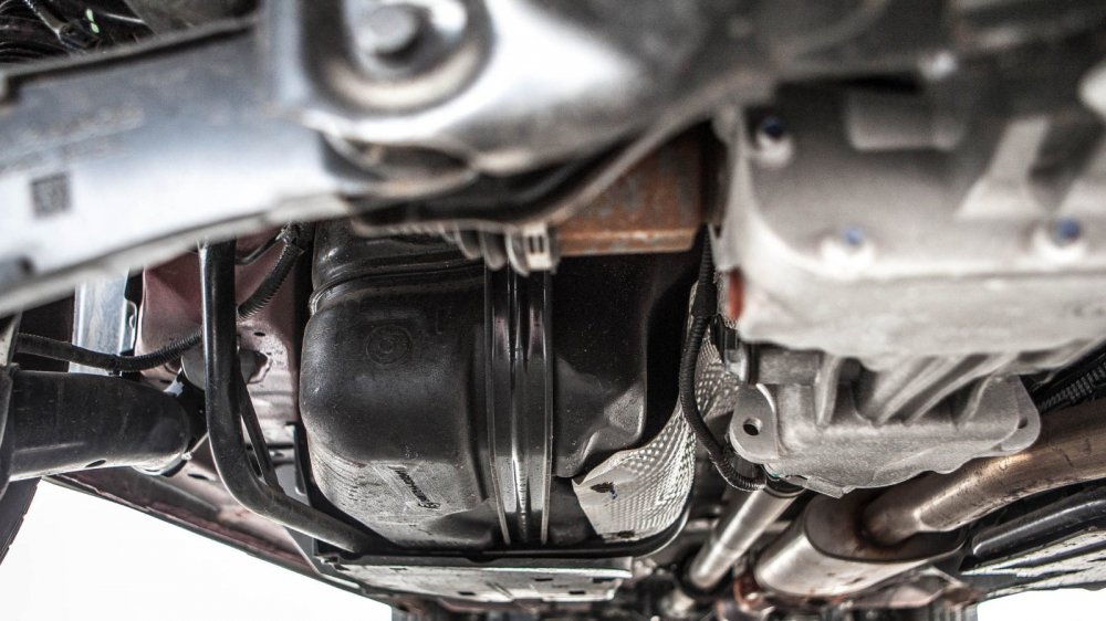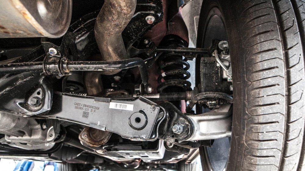 И коротенько по днищу. Самой низкой точкой в базе стал пластиковый «полукожух» топливного бака – чуть хлиплый на вид, и, вполне может быть, могущий стать первой жертвой выезда на бездорожье. С другой стороны, когда машина в порожнем состоянии, от него до земли остаётся около 20 см. Сам бак имеет ещё и дополнительный защитный элемент в виде трубчатой рамы. В районе задней оси просвет ограничивают кронштейны крепления нижней точки рычагов у колеса – под ними где-то около 16 см. В целом по днищу ничего подозрительного или опасно свисающего я не обнаружил, хотя обстоятельно приглядеться, признаюсь, времени у меня не было.