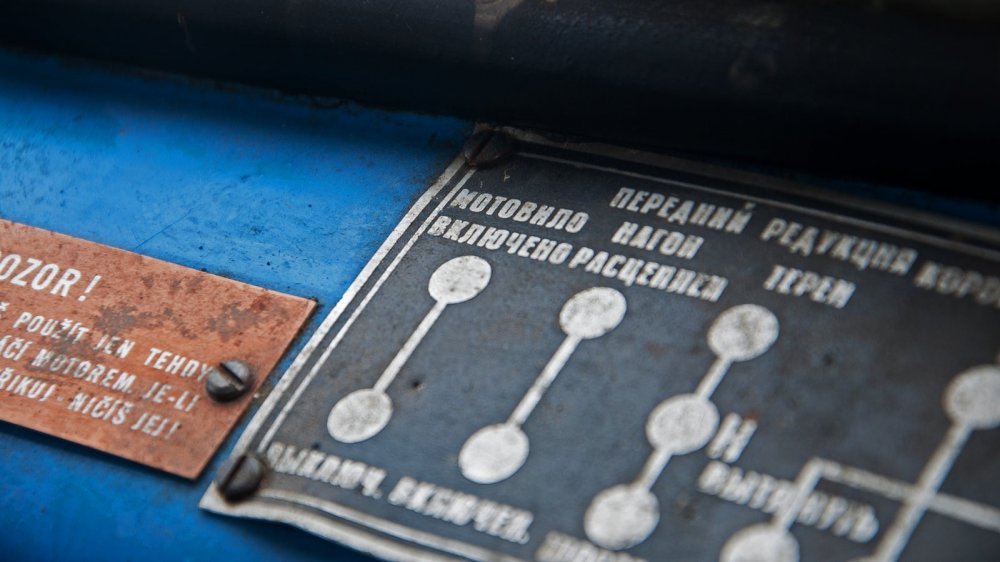 Все остальные органы управления тоже оказались ровно там, где их и хотелось бы видеть. А вот таблички-подсказки слегка ввели в ступор. Моих познаний чешского языка, заканчивающихся на словах “йожин с бажин”, не хватило, чтобы понять, что такое “мотовило”, которое может быть включено или выключено, и чему “позор” на передней панели. Ну ладно. Мы видали всякое, справимся и без подсказок. Тем более что схема переключения всё-таки понятна, и она классическая. Правда, чтобы включить заднюю передачу, рычаг надо не только потащить на себя, но ещё и приподнять вверх. Это такая “защита от дурака”.