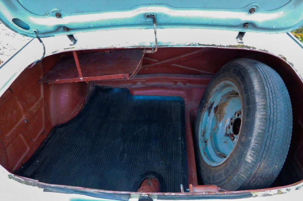 Ладно, вернёмся к багажнику. Крышка сильно заходит на заднюю панель. Погрузочная высота повыше, чем в Волге ГАЗ-21, но ниже, чем в Москвиче 412, 2140 или в Жигулях. Прямо под багажником на задней панели прикрытая кронштейном номера заливная горловина бензобака. Такая точно останется на Москвичах вплоть до модели 2140 и даже на музейном прототипе 3-5-6. Это ноу-хау Андронова. На заправке не важно, правым или левым боком подъехать к колонке и бензин ночью не сольют. Да, багажник поменьше, чем в Москвиче-2140 и Жигулях, много места занимает запасное колесо. Но тоже всё, что надо увезти можно. Он очень интересно освещается ночью. С наружной стороны крышки багажника – «дизайнистый» корпус фонаря освещения номера, а с тыльной прямо напротив той же лампочки – окошко, закрытое слюдой. Через него лампа освещения номера заодно освещает внутренность багажника. Остроумно и просто, как всё гениальное. Кстати, петли багажника стоят снаружи. Как же они мешают на иных современных седанах!