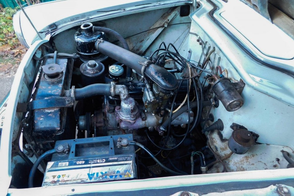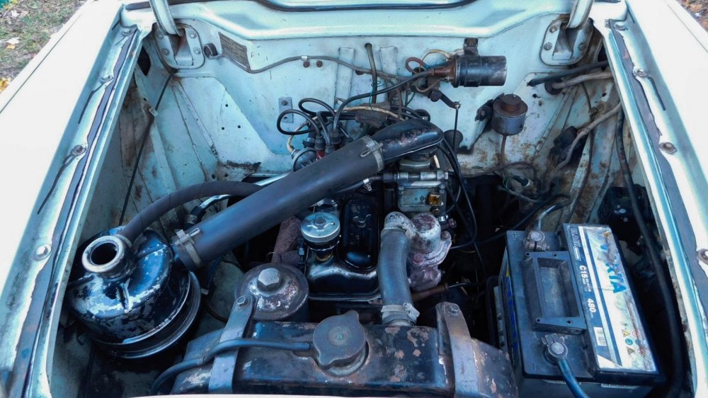 Вот он, заслуженный 1,4-литровый двигатель. Однокамерный карбюратор находится слева, впускной коллектор очень непростой – изнутри в нём скрыты трубы подогрева. Во времена этих машин не всем был доступен антифриз. Дома на плите разогревали ведро воды и заливали в радиатор. Кипяток, попав в систему охлаждения, согревал поступающую в цилиндры смесь.