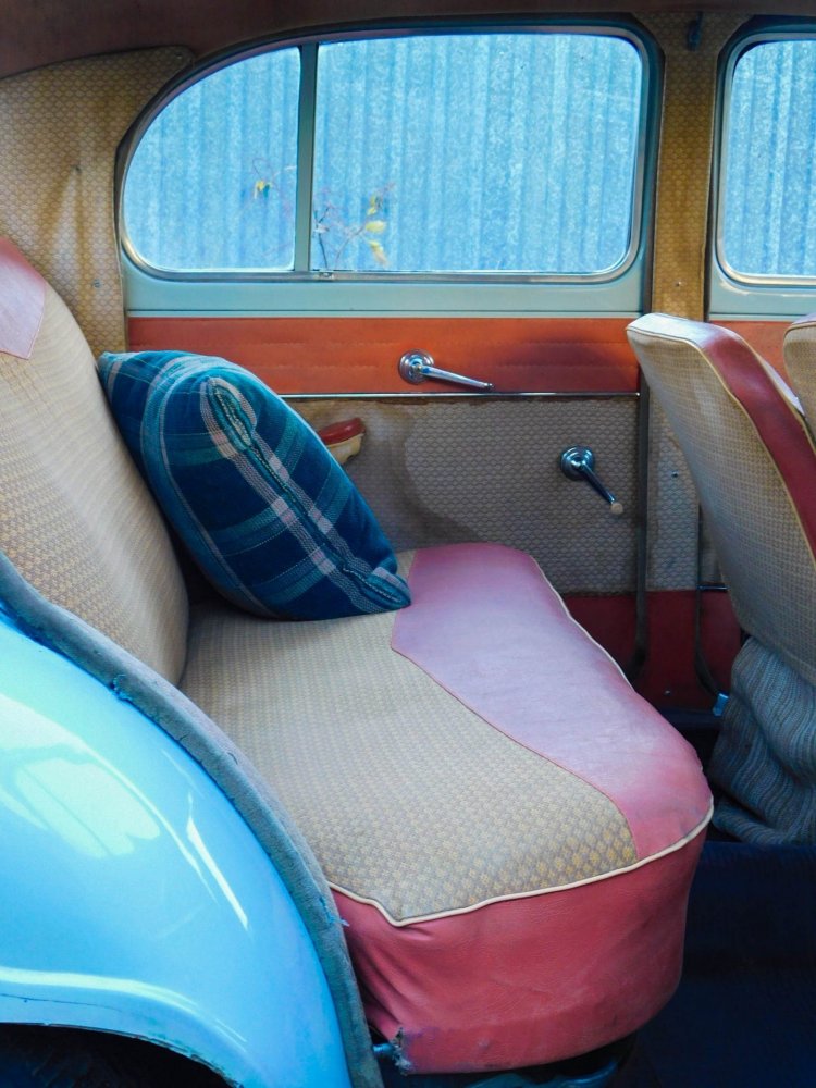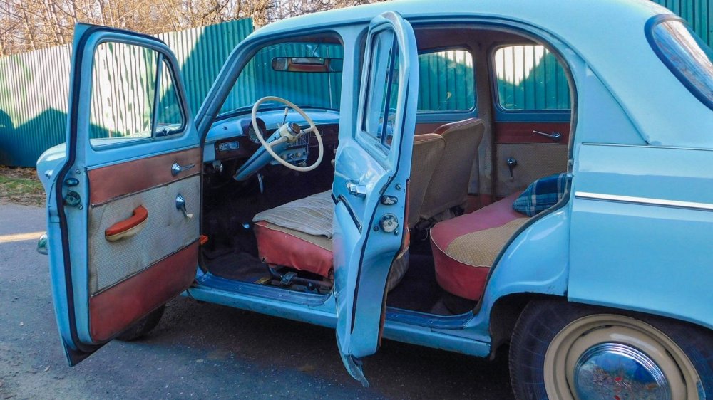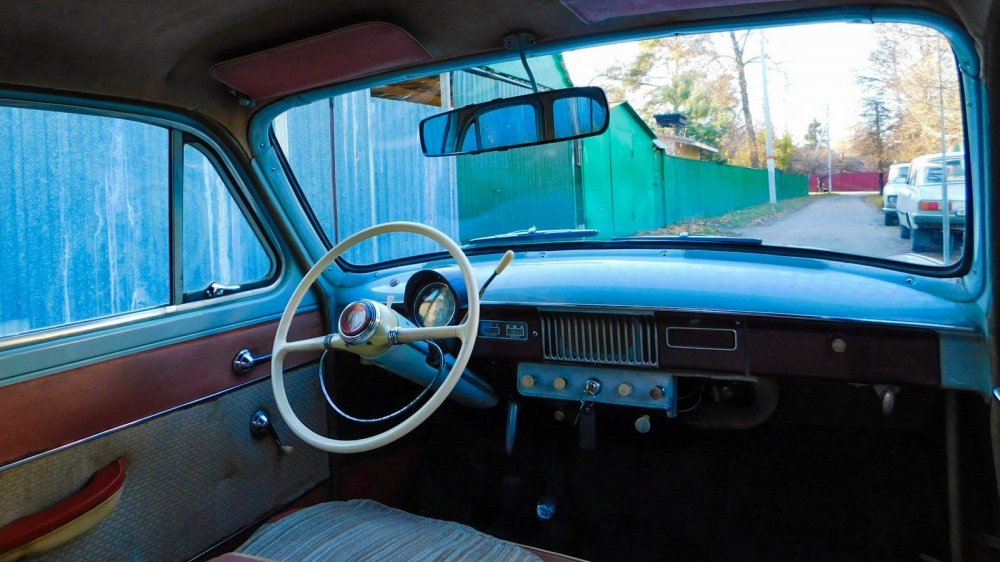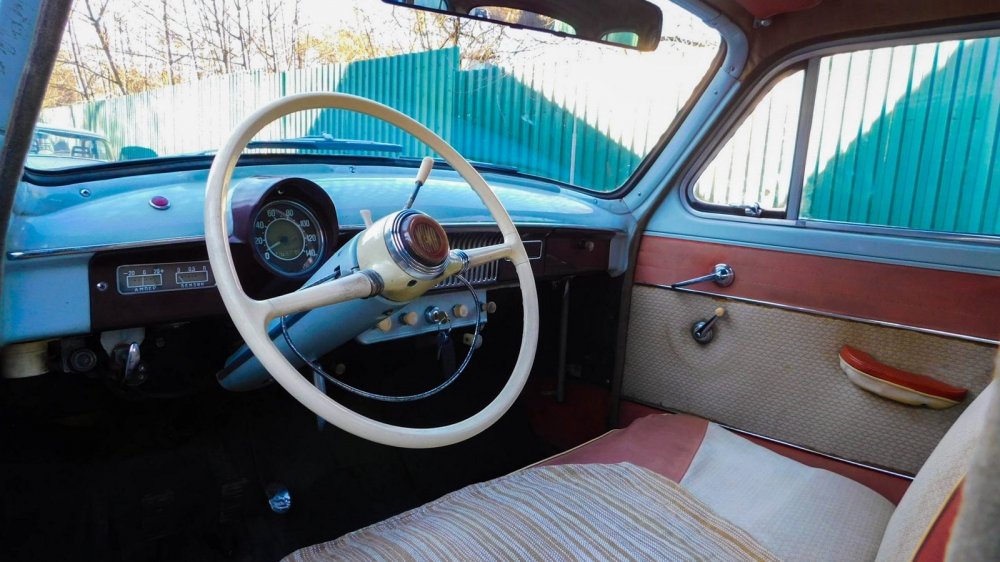Салон, конечно, не такой огромный, как в Волге ГАЗ-21, но совсем не тесный. Этому очень способствуют продуманно тонкие спинки переднего сиденья. У него цельная подушка для водителя и пассажира, но спинки установлены отдельно. Диванчик выпуклый посередине, а его края ощутимо «скатываются» вниз. Сиденье очень мягкое и удобное, а что подголовников в те времена не существовало – не страшно. Сам диван можно сдвинуть ближе к рулю, а можно отодвинуть. А ещё можно сдвинуть всё сиденье вперёд до упора, откинуть назад спинки и вместе с подушкой заднего дивана получится настоящая ровная «двуспальная» поверхность. В 50-е годы считалось, что в дальнем путешествии водитель и пассажиры смогут, разложив таким образом сиденья, устроиться с комфортом на ночлег. Тогда такое практиковалось часто.