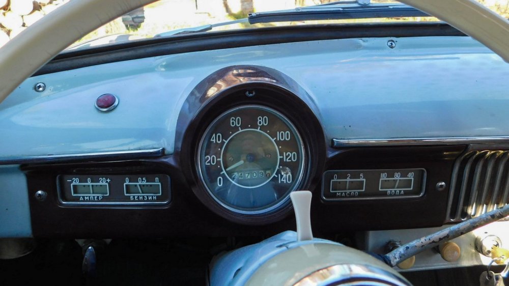 Маленькие педали сцепления и тормоза «растут» прямо из пола. Расположены они под удобным углом, и усилия на них минимальны. Подвесная педаль газа, похожая на ложку, мало отличается от той, которая у значительно младшего по возрасту Москвича 2140. Рядом с замком – как будто вырезанные из слоновой кости ручки «подсоса», включения габаритного и ближнего света в фарах, выключатели отопителя и «дворников». Когда печка включена, внутри её ручки, прямо сквозь светлую пластмассу, светится лампочка.